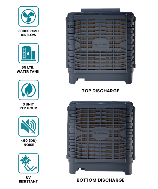 The Venus Air Cooler is a high-performance cooling solution designed for industrial and commercial spaces. With an impressive airflow capacity of 30,000 CMH, it effectively cools areas up to 3,000 sq. ft. Its energy-efficient 3.7 kW motor, durable 6-blade axial fan, and robust air pressure ensure optimal cooling performance. Equipped with a 45-liter water tank, manual/auto drain options, and a built-in dust filter, it delivers fresh, clean air while minimizing maintenance. Compact and versatile, the Venus Air Cooler is ideal for large-scale cooling needs with flexible installation options and low noise operation.
